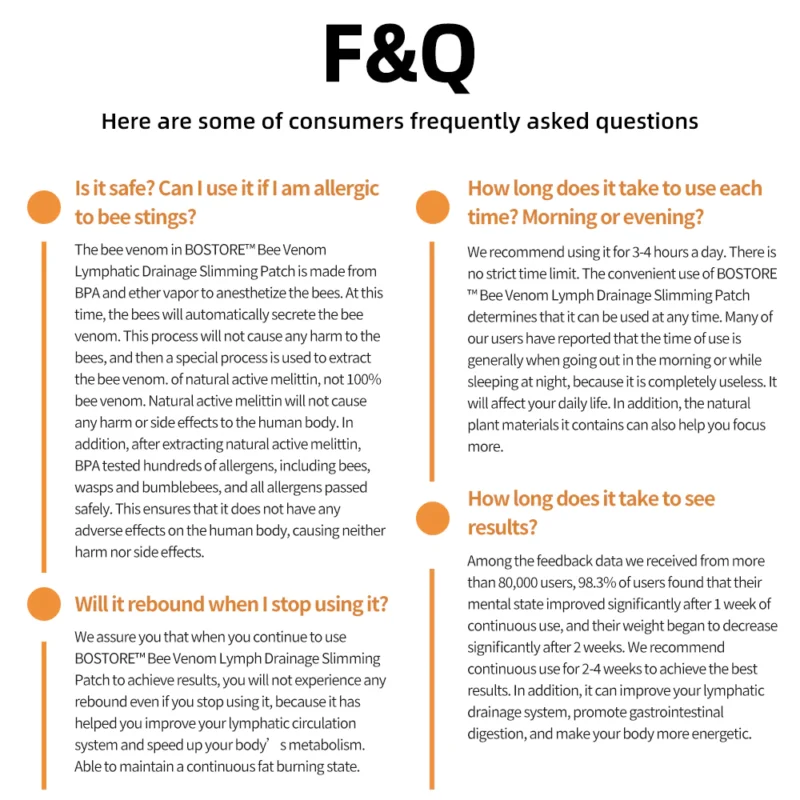 I have combined various botanical ingredients, long known for their benefits to the lymphatic system and body metabolism, to create Furzero™ Bee Venom Detox Slimming Patch. Experimental evidence indicates that this lymphatic drainage slimming patch is the optimal choice for improving the lymphatic system.The blend of these natural botanical ingredients, coupled with the potent properties of bee venom, offers a groundbreaking solution for swiftly addressing metabolic disorders and lymphatic congestion issues.