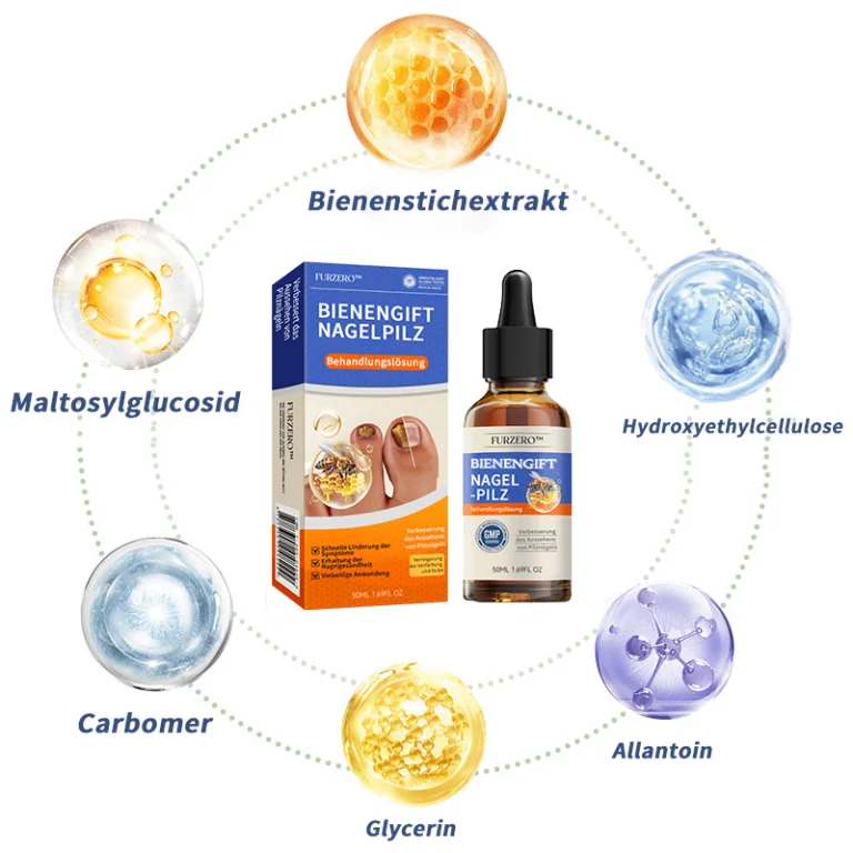 Das Furzero™ Serum verfügt über eine kraftvolle Formel, die mit Bienengift angereichert ist, das Peptide und Proteine mit starken antimikrobiellen Eigenschaften enthält. Diese bioaktiven Verbindungen zielen effektiv auf verschiedene Mikroorganismen, einschließlich Pilze, ab, indem sie deren Zellstrukturen stören und ihre Stoffwechselprozesse beeinträchtigen. Dies bietet eine wirksame Lösung zur Erhaltung gesunder, pilzfreier Nägel.