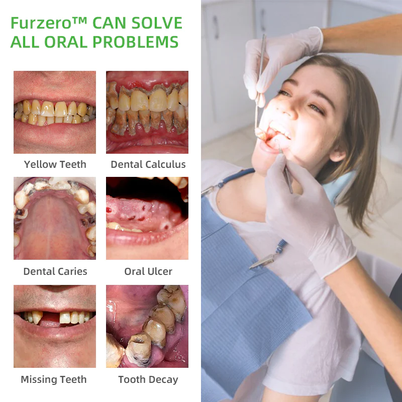 FURZERO™can kill 99.99% of BACTERIA, eliminate BAD BREATH, remove tooth PLAQUE and TARTAR, heal GINGIVITIS and PERIODONTITIS, relieve toothache, prevent and remove CAVITIES, restore tooth enamel, stimulate the formation of restorative dentin, and stimulate the regeneration of lost teeth.