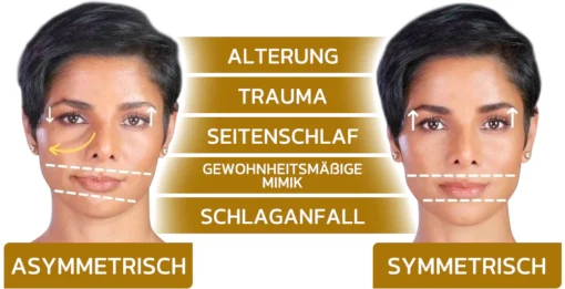 Asymmetrie im Gesicht ist ein häufiges Phänomen, und nur selten hat jemand ein perfekt symmetrisches Gesicht. Eine Studie der National Library of Medicine aus dem Jahr 2015 ergab, dass Asymmetrie im Gesicht in der Allgemeinbevölkerung weit verbreitet ist. Dies kann auf verschiedene Faktoren zurückgeführt werden, darunter Alterung, Trauma, gewohnte Schlafpositionen, muskuläre Ungleichgewichte, Zahnprobleme und Erkrankungen wie Schlaganfall.