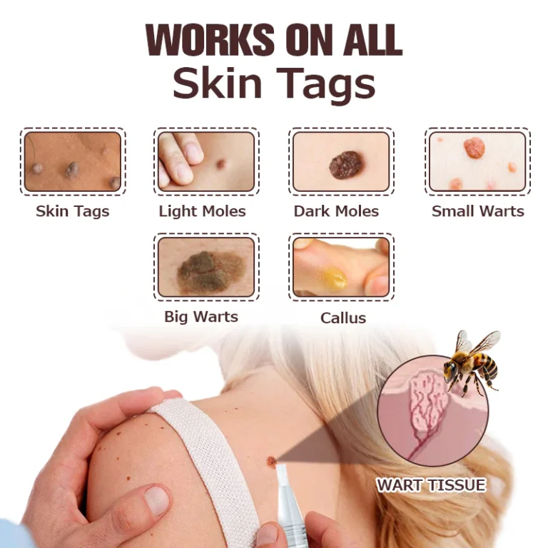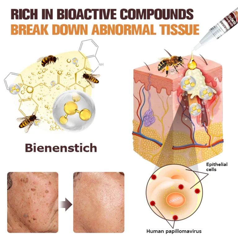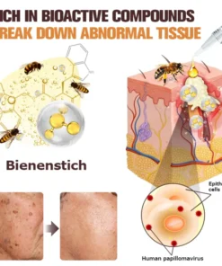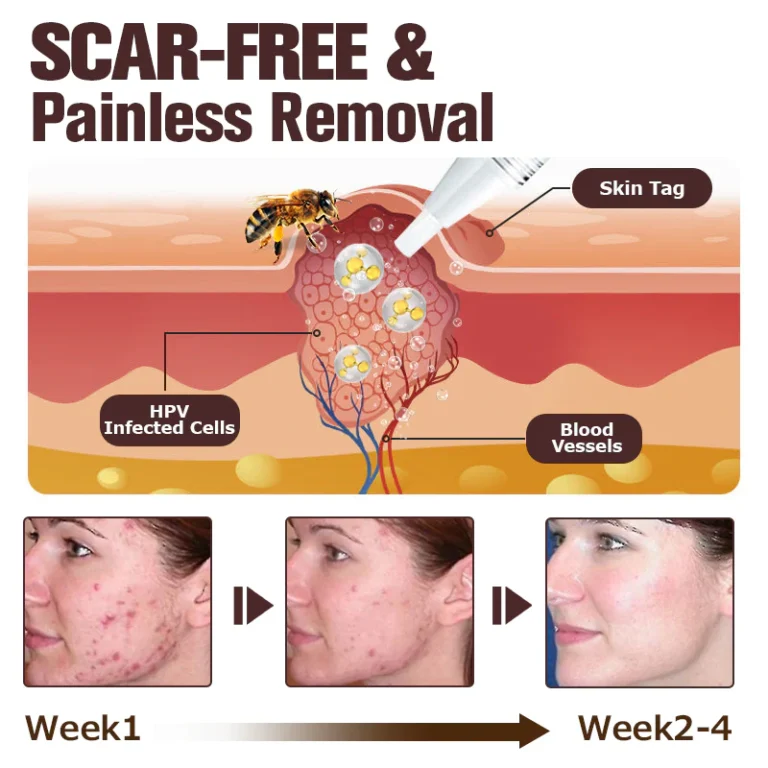 Bee venom contains several bioactive compounds, including melittin, apamin, and adolapin which has been scientifically proven to tackle skin tags or warts effectively. Among its arsenal of enzymes, phospholipase A2 stands out for its ability to break down abnormal tissue, simplifying the removal process of skin tags or warts.