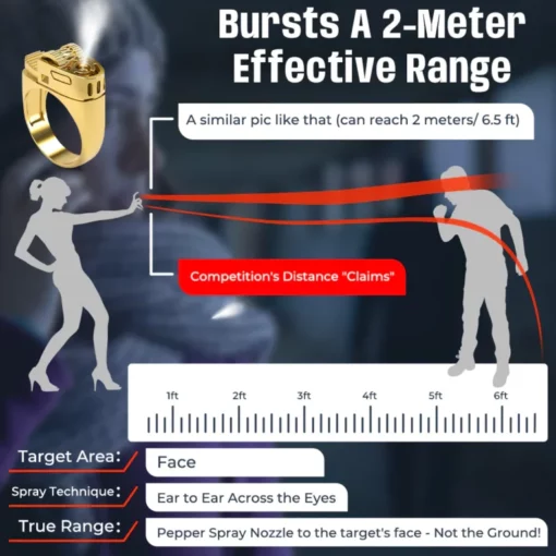 With 2-3 one-second bursts, the ring ensures an effective range of at least 2 meters, establishing itself as an essential self-defense tool. This device not only safeguards you but also maintains a secure distance from potential attackers, offering an invaluable layer of protection to your life. It seamlessly blends style with functionality, allowing you to enhance your personal safety without compromising on elegance.