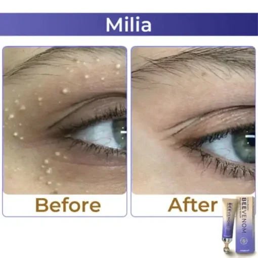 Bee Venom can help normalize the skin’s oil production around the eyes by regulating sebum levels, reducing the chances of clogged pores that can lead to milia in this delicate area. bee venom promotes a balanced skin environment, helping to reduce existing milia and prevent their future formation, resulting in smoother and clearer skin around the eyes.