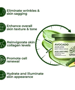 GFOUK™️ Avocado Ageless Body Cream Scrub reduces and lifts sagging on the skin through its combination of key ingredients. Avocado oil, eucalyptus oil and clove leaf oil stimulate collagen production, increase skin thickness and encourage cell regeneration, ultimately diminishing the appearance of wrinkles and sagging. The cream’s biochemistry replenishes collagen diminishing sagging and wrinkles while also replenishing hydration, making skin look supple and youthful.