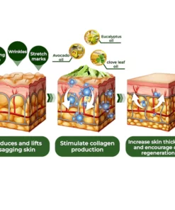 Eucalyptus Oil: Eucalyptus oil has stimulating properties that can promote blood circulation. Improved circulation can help deliver essential nutrients and oxygen to the skin cells substantially aiding in the revitalization of sagging skin.