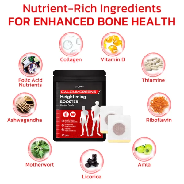 The GFOUK™️ CalciumGreens Heightening Booster Herbal Patch includes a rich blend of essential nutrients like Collagen, Vitamin D, Thiamine, Riboflavin, Amla, Licorice, Motherwort, Ashwagandha, and Folic Acid. This carefully crafted combination supports bone health and height enhancement, strengthening bones, aiding calcium absorption, promoting energy metabolism, and providing various health benefits. With this powerful blend, the patches offer an effective formula to help individuals achieve their height goals and maintain overall skeletal wellness.