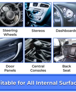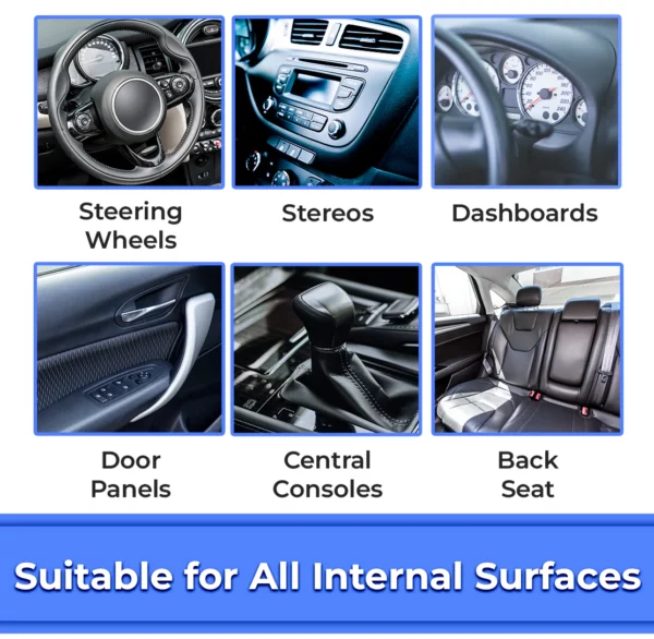 It is safe to use on all interior surfaces, such as steering wheels, stereos, dashboards, door panels and central consoles.