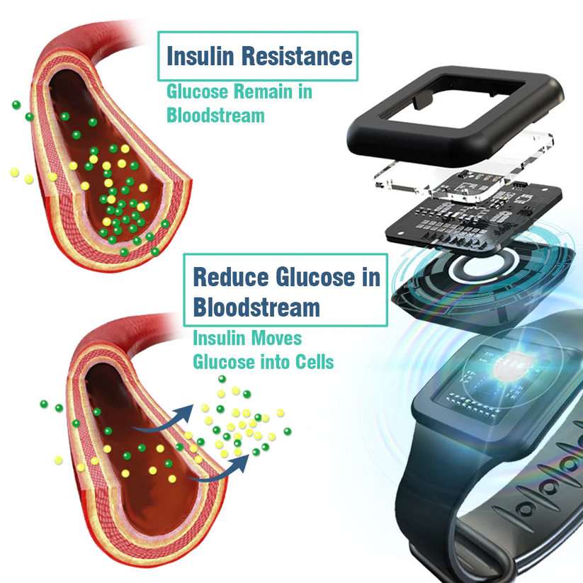 The GFOUK™️ SucroseGuard Electric Pulse Balance Device uses EMS technology to improve insulin sensitivity. Electrical muscle stimulation works by delivering controlled electrical pulses to strengthen muscle tissue. This process leads to increased glucose uptake by the muscle cells. The contraction of the muscles leads to an increased uptake of glucose from the bloodstream, this increased glucose uptake facilitates its efficient conversion into energy within the muscle cells, reducing the concentration of glucose circulating in the bloodstream.