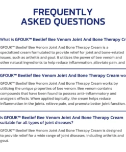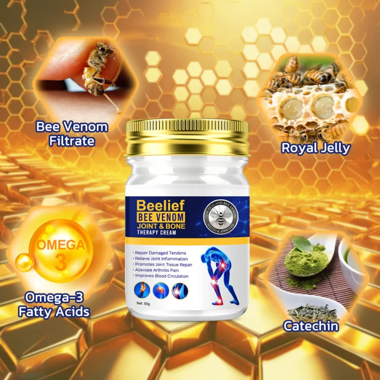 The GFOUK™ Beelief Bee Venom Joint And Bone Therapy Cream features four powerful ingredients known for their effectiveness in treating arthritis and bone-related diseases. Bee venom filtrate, a key component, offers anti-inflammatory, analgesic, antimicrobial, antioxidant, and immune-regulating properties. It has 4 main ingredients; includes Royal jelly, green tea extract, Omega-3 and Catechin