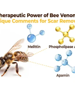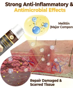 Diminishes inflammation in scar tissue, a crucial process since extended inflammation can result in more severe and persistent scars. The primary component of bee venom, Melittin, possesses potent anti-inflammatory and antimicrobial properties. By alleviating the inflammatory response, the spray effectively reduces the swelling and redness commonly linked to scars.