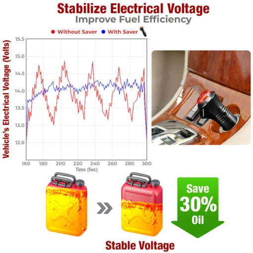EcoCharge Car Fuel Saver is designed to stabilize your vehicle’s electrical voltage, fostering more efficient combustion in the engine. With a stable voltage, your car operates smoothly, potentially improving fuel efficiency and saving you money on fuel costs.