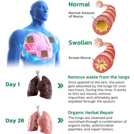 The GFOUK™ FreshAir Herbal Lung Cleanse Repair Patch contains a powerful blend of 7 natural plant extracts. These extracts, including golden plum extract, oleanolic acid, and vitex calcium, work together to effectively reduce local inflammation, combat respiratory allergies, promote fluid secretion in the lungs, and help thin out accumulated phlegm and waste. This allows for easy passage through the trachea and ultimately results in improved breathing.
