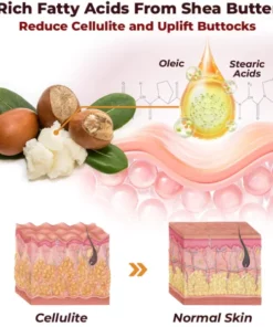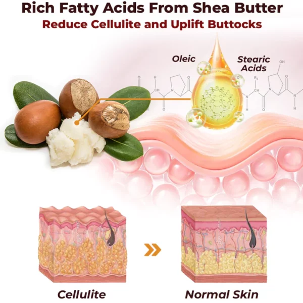 Shea butter is known to have the potential to boost collagen production in the skin, which can enhance the skin’s elasticity and contribute to preventing sagging in the hip area. Furthermore, its rich fatty acid composition, including oleic and stearic acids, plays a crucial role in retaining moisture, ensuring the skin remains well-hydrated and aiding in the reduction of cellulite on the buttocks. Additionally, shea butter has its ability to reduce the appearance of scars and stretch marks. Its moisturizing and skin-regenerating properties can be instrumental in enhancing the texture and overall tone of areas affected by these concerns.
