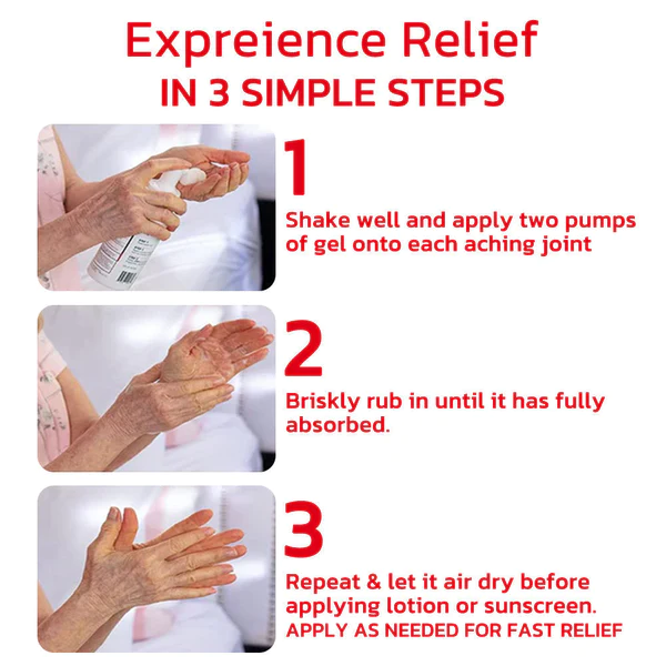 Wenn das Relief-Gel auf die betroffene Stelle aufgetragen wird, dringt es in die Haut ein und gibt seine aktiven Komponenten an das betroffene Gelenk ab. In Synergie wirken diese Komponenten effektiv schmerzlindernd, entzündungshemmend und fördern den Heilungsprozess.