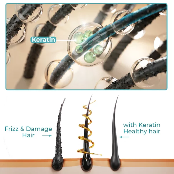 Keratin is a protein that may improve the look of hair by improving its texture, luster, and general health. Keratin smoothes the cuticle, which is the outer protective covering of the hair. A smoother cuticle reflects light more effectively, making the hair look sleeker and more polished.
