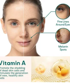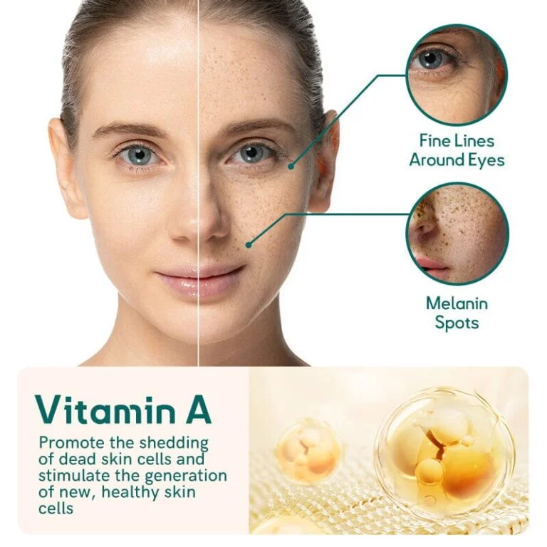 Vitamin A helps accelerate the skin’s natural exfoliation process. They promote the shedding of dead skin cells and stimulate the production of new, healthy skin cells. This renewal process results in smoother, brighter skin and helps improve the appearance of fine lines.