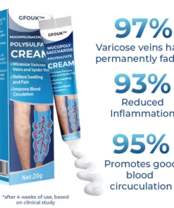 GFOUK™ Mucopolysaccharide Polysulfate Cream help reduce swelling and discomfort associated with varicose veins. They may provide temporary relief from symptoms such as pain, itching, and a feeling of heaviness in the legs.