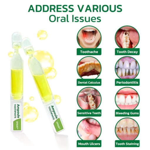 The GFOUK™ PearlWhite Plant Extract Ampoule Toothpaste is endorsed by the American Dental Association and dental professionals, is the answer to comprehensive oral care. It effectively addresses an array of issues including tartar, bad breath, ulcers, cavities, bleeding gums, sensitivity, gingivitis, periodontitis, and more. Crafted from 100% natural herbs, it’s suitable for all ages, ensuring optimal oral health without any side effects.