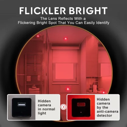 Infrared technology is a key component of GFOUK™ Portable Infrared Anti-Camera Peeping Detector. Infrared detectors detect the infrared radiation emitted by hidden cameras, convert it into electrical signals, and then amplify and process them to reveal the presence of the hidden camera. In addition, the GFOUK™ Portable Infrared Anti-Camera Peeping Detector emits a ring of red LED light, and when the tiny camera is viewed by a special lens with this aperture, the camera lens appears as a bright red dot. The device captures light reflected from the camera lens, making it easy to detect hidden surveillance devices.
