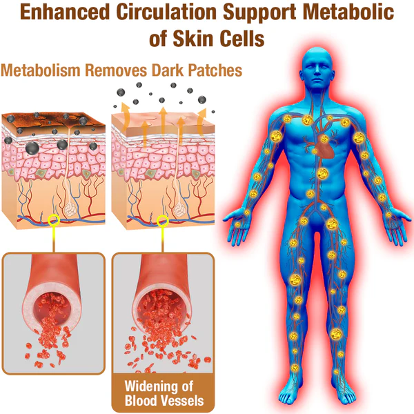 This enhanced circulation support the metabolic processes of skin cells, it leads to the removal of pigmented or damaged cells, aiding in the reduction of dark and thickened patches on the skin.