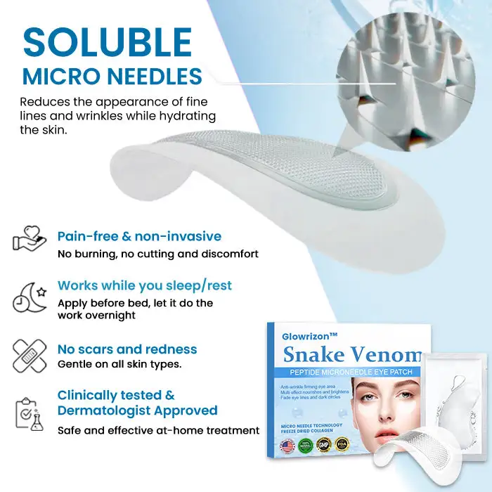 In a study of over 1,000 users, Glowrizon™ delivered a 96% improvement rate in reducing eye wrinkles, puffiness, and dark circles within 2 weeks. Most participants reported visible tightening and brightening effects after just one week of use, with no irritation or adverse reactions. Thanks to its advanced microneedle delivery system and snake venom peptide formula, Glowrizon™ penetrates deeply to rejuvenate the skin from within — offering a non-invasive, surgery-free solution for aging eyes.