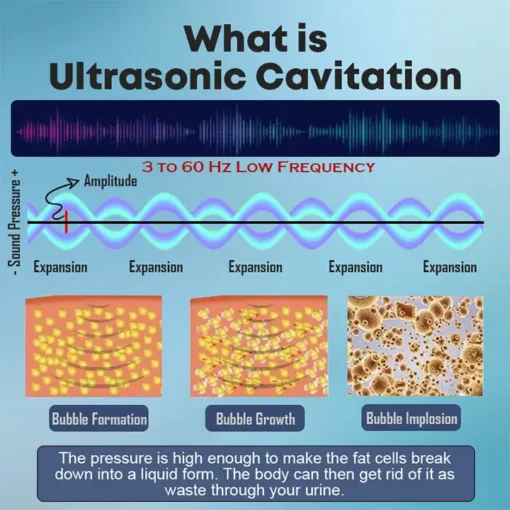 Ultrasound therapy is a non-invasive. cutting-edge treatment. The American Institute of Ultrasound in Medicine (AIUM) has demonstrated its ability to eliminate toxins and reduce body fat. It utilizes the “cavitation” effect of sound waves to produce a series of pressure changes that directly target fat tissue. This action induces fat cells to oscillate. rupture and break down. effectively treating stubborn fat deposits and cellulite. In addition. it enhances muscle elasticity and promotes cellular metabolism.