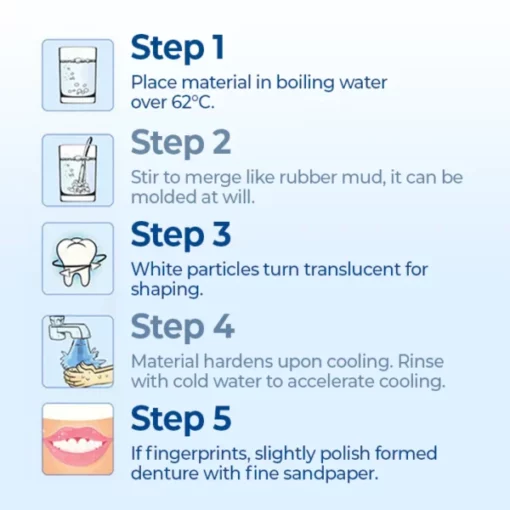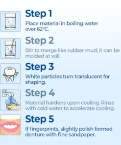 - TIPS: If you want the color of the temporary teeth to be more natural, you can use boiling tea or coffee water to dye it. The material is reusable. You can reheat it and remold it for multiple uses.