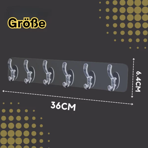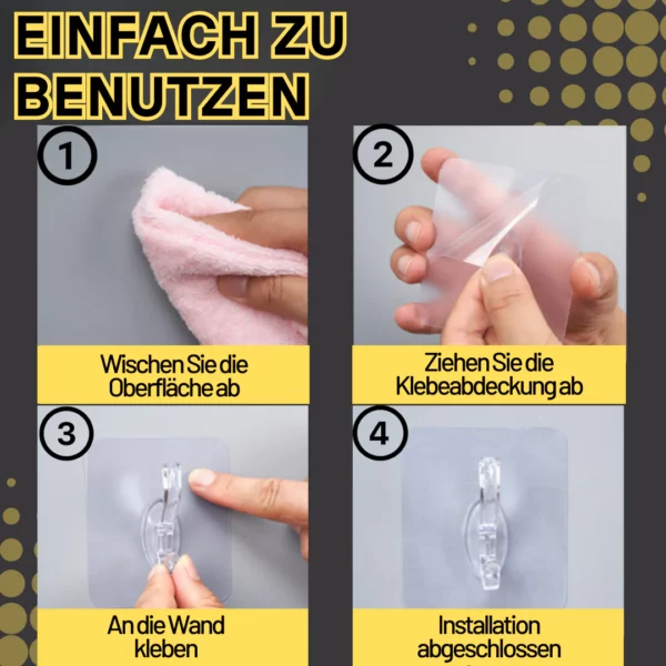 Kein Bohren erforderlich, einfach die Schutzfolie auf der Rückseite des Hakens abziehen und durch Drücken an der Wand befestigen