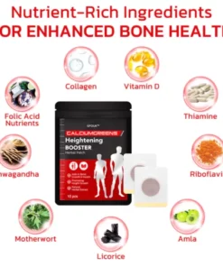 The GFOUK™️ CalciumGreens Heightening Booster Herbal Patch includes a rich blend of essential nutrients like Collagen, Vitamin D, Thiamine, Riboflavin, Amla, Licorice, Motherwort, Ashwagandha, and Folic Acid. This carefully crafted combination supports bone health and height enhancement, strengthening bones, aiding calcium absorption, promoting energy metabolism, and providing various health benefits. With this powerful blend, the patches offer an effective formula to help individuals achieve their height goals and maintain overall skeletal wellness.