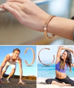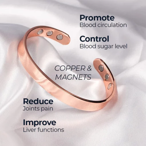 TheHEALTHTECH™ Cholesterol Blood Sugar Magnetic Therapy Bracelet is made of 99% pure copper that is 100% hypoallergenic and free of lead and nickel. Our sleek copper bracelet is also crafted with 6 rare earth Neodymium magnets that sit close to the wrist and tendons for dual therapeutic effect. While wearing this adjustable bracelet, the skin absorbs tiny particles of copper, while the magnetic effect increases blood flow, relieving arthritic pain, carpal tunnel inflammation, body fatigue, muscle tension, and migraine.