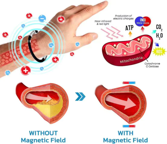The Healthylife™ blood pressure regulator bracelet is the latest in medical technology. The bracelet is fully magnetized at 55mT at 10mm intervals in alternating north and south polar directions. This allows the energy from the entire bracelet TitaniumION energy from the entire bracelet to spread its effects over a wide area, improve metabolism, increase heart contraction, dilate blood vessels and stimulate blood flow. increases cardiac contractility, dilates blood vessels and promotes blood flow.