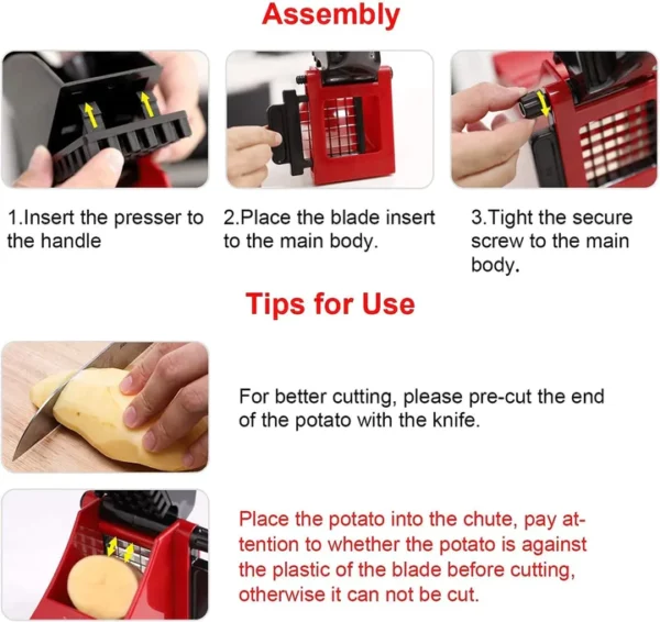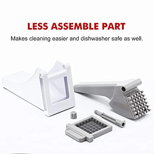 - 🍟Safe & Easy to Clean – The french fry cutter is made of food grade ABS material, non-toxic and without BPA. Take fewer parts to clean, which helps to clean the fry cutter under running water in seconds.