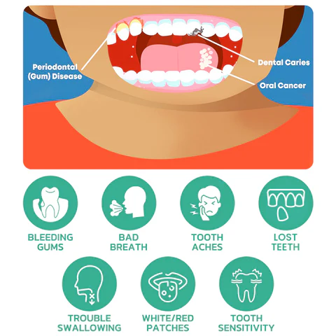 Food leftovers in our mouths every day let bacteria and tiny organisms grow in the spaces between our teeth and inside our mouths. This can cause lots of oral problems like bad breath, mouth sores, yellow teeth, cavities, plaque, swollen and bleeding gums, toothaches, loose or missing teeth, and even oral cancer.