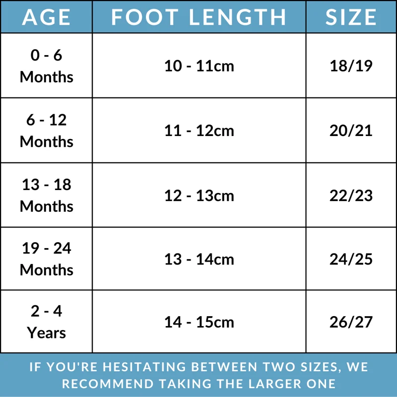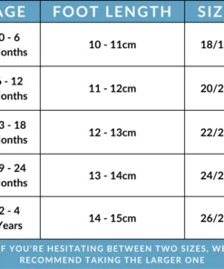 – Shoe size from 18 – 27 (see size chart)