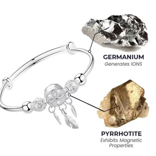 - Pyrrhotite – is a magnetite that has magnetic properties. The Histone™ LeanLine Magnetic Bangle is designed with the unique use of pyrrhotite to harness the power of magnetic therapy. Magnetic therapy realigns the electromagnetic charge in the body’s cells to promote self-healing, which is beneficial to the lymphatic system. The magnetic field heals by alkalizing the tissue and releasing oxygen from its bound state back into the molecular state. It also remarkably reduces swelling of the lymph nodes and reduces 60% excess lymph fluid in consistency.