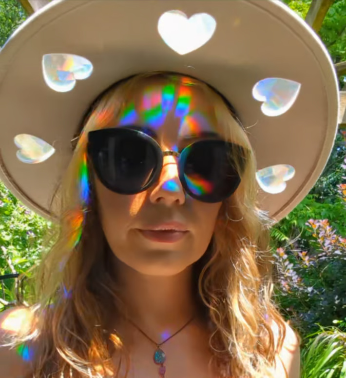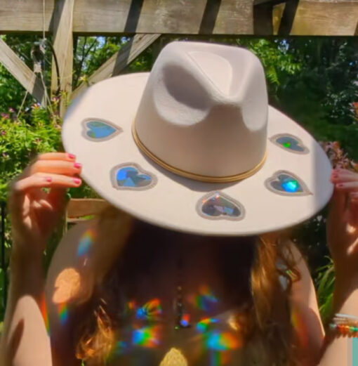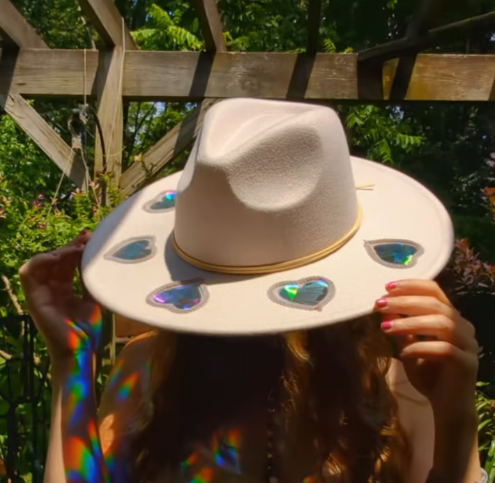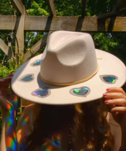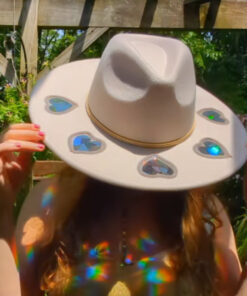 Keywords: holographic cowboy hat, heart cut-out hat, rainbow sun hat, festival hat, UV protection hat
