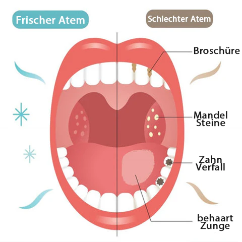 Wenn sich der Zustand weiter verschlechtert, entwickeln sich Mundgeruch, Zahnfleischentzündung und andere Probleme. Zu diesem Zeitpunkt zerfressen Bakterien Ihr Zahnfleisch und verursachen Zahnfleischbluten, Schmerzen, Rötungen und andere Probleme. Wenn diese Probleme nicht rechtzeitig gelöst werden können, verschlimmern sich Ihre Mundprobleme und Sie leiden unter Parodontitis, Plaque, Zahnstein, lockeren Zähnen, Zahnschmerzen und anderen Problemen und können sogar zum Zahnverlust führen.