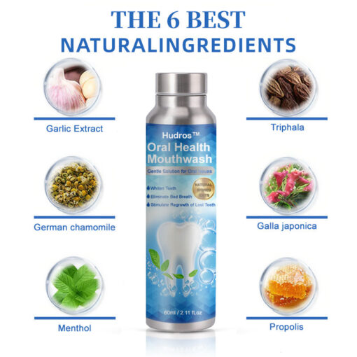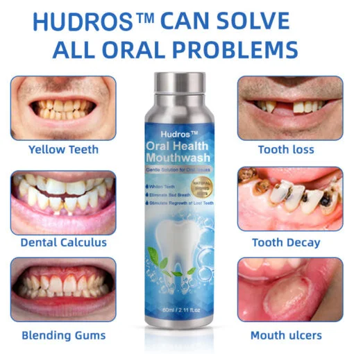 Hudros™ Oral Health Mouthwash is the latest product certified by the American Dental Association and recommended by dentists. It can perfectly solve all oral problems, including dental calculus, bad breath, oral ulcers, dental caries, bleeding gums, tooth sensitivity, gingivitis, loose teeth, periodontitis, swollen gums, tooth damage, tooth loss, etc. No side effects. Made from 100% natural herbs. Suitable for everyone, including children, young people, and the elderly.