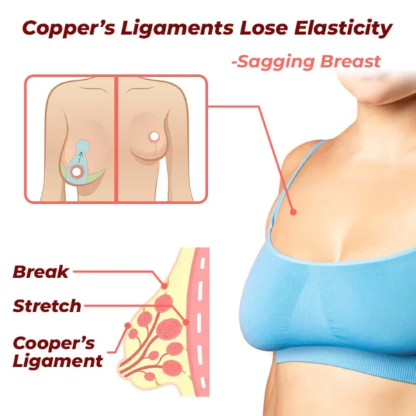 As one ages, Cooper’s ligaments that form the basis of breast tissue weaken and lose their elastic properties. This results in reduced volume in the breast, which can be especially visible during menopause due to decreased fat and tissue support.