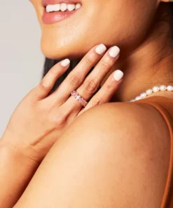 Hand-crafted in 14k gold plating, this pink eternity ring is inspired by timeless design. Featuring a band filled with glittering pink cubic zirconia. A piece fit for royalty, make heads turn in this eye-catching design.