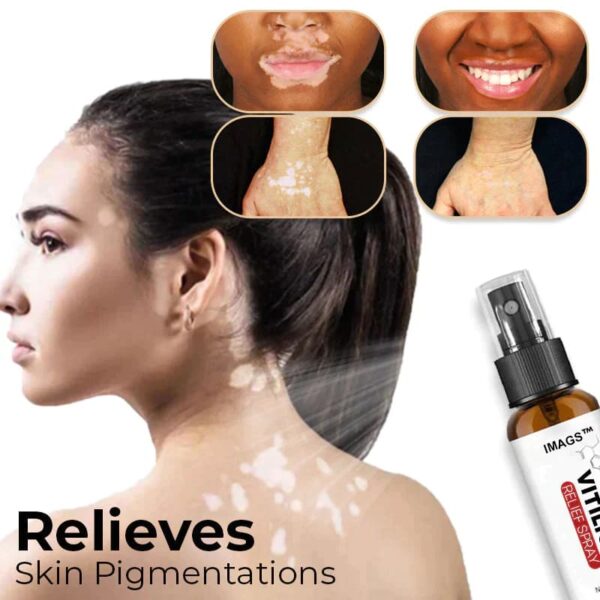 IMAGS™ Vitiligo Relief Spray’s intense moisturizing solution penetrates thick areas of skin to provide both instant and long-lasting relief. Effectively treats hyper pigmented skin issues all over your body, including vitiligo, leukoplakia, skin discolouration, and other pigmentation diseases of the skin.