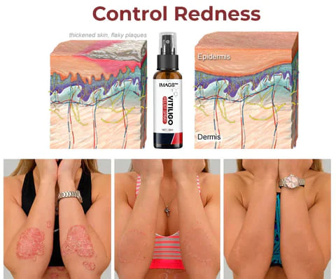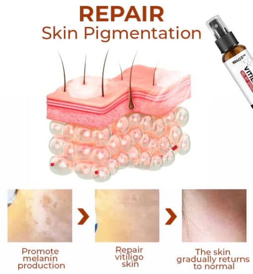 IMAGS™ Vitiligo Relief Spray helps Improve the physiological balance of melanocytes and keratinocytes in the vitiligo epidermis. Regulates skin pigmentation with its natural formula that can regulate pigmentation, repair vitiligo, and promote melanin recovery.