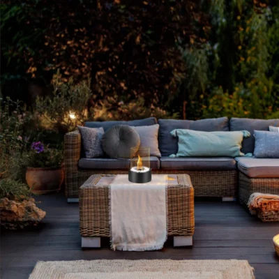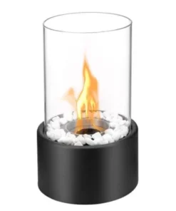 - Tabletop Fire Pit: This simple and elegant portable fire pit features a durable metal base and clear glass hurricane