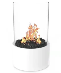 Modern in every sense of the word, this elegant indoor tabletop fireplace sports a sleek black metal base and a removable cylindrical glass body