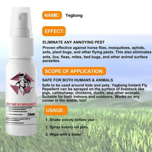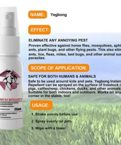 - Safe for both Humans & Animals: Safe to be used around kids and pets. Instant Equine Fly Repellent can be sprayed on the surface of livestock like pigs, cattle, sheep, chickens, ducks and other animals.