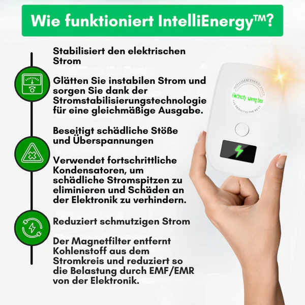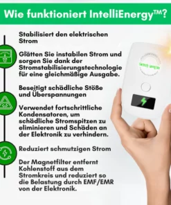 Dieses innovative IntelliEnergy™ Stromspargerät reduziert nicht nur den Stromverbrauch, sondern sorgt auch für eine stabile Spannung und gleicht den Stromfluss aus. Durch die Vermeidung von Spannungsinstabilität trägt es aktiv dazu bei, die Lebensdauer Ihrer elektrischen Produkte zu verlängern. Entscheiden Sie sich für eine vereinfachte und effektive Lösung, die Ihnen nicht nur Geld spart, sondern auch die Langlebigkeit Ihrer wertvollen elektronischen Geräte sichert.
