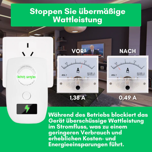 Entdecken Sie eine einfache, aber äußerst effektive Methode, um Ihren Stromverbrauch zu senken und erhebliche Einsparungen von 20 % bis 30 % zu erzielen, ohne den Aufwand komplexer Systeminstallationen. Schließen Sie diesen innovativen Stromsparer einfach an eine handelsübliche Steckdose an und profitieren Sie von einer spürbaren Reduzierung Ihrer Energiekosten. Erleben Sie die Leichtigkeit und die unmittelbare Wirkung, wenn Ihre Stromkosten mit dieser benutzerfreundlichen Lösung mühelos sinken.