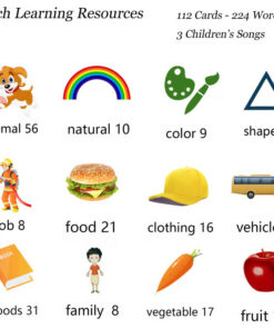 Our Interactive Toddler Vocabulary Cards include 112 double-sided cards featuring 224 carefully selected words across 12 popular categories such as animals, foods, vehicles, fruits, shapes, jobs, and more. This all-in-one educational tool is perfect for toddlers aged 1 to 4, helping them build a strong vocabulary foundation while exploring diverse topics.