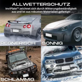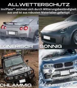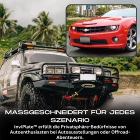 InviPlate™ ist nicht nur eine typische Nummernschildabdeckung™, sondern wurde auch sorgfältig für Personen entwickelt, die Wert auf Privatsphäre in einzigartigen Situationen legen. Ganz gleich, ob Sie Ihr Fahrzeug auf einer Automesse ausstellen oder sich in Offroad-Abenteuer wagen, unser Produkt ist darauf zugeschnitten, dass Ihre persönlichen Daten diskret verborgen bleiben. InviPlate™ erfüllt die unterschiedlichen Bedürfnisse derjenigen, die sowohl Funktionalität als auch Privatsphäre in einer Vielzahl von Szenarien suchen, und bietet eine vielseitige und effektive Lösung.