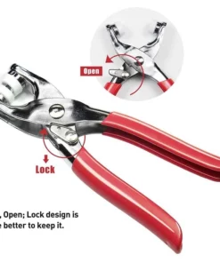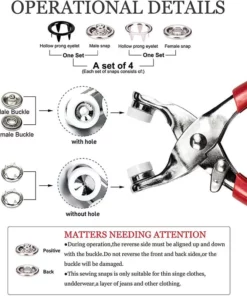 - Put the hollow prong rings on the pliers lower side without-hole and the male and female snaps on the pilers’ upper side with hole.